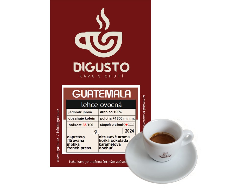 V Guatemale jsou různé klimatické podmínky a bohatá vulkanická půda, která je ideální pro pěstování kávy. Guatemalská kávová zrna jsou plná s různou úrovní kyselosti a mají obecně čokoládové tóny s náznaky ořechových a sladkých karamelových tónů.